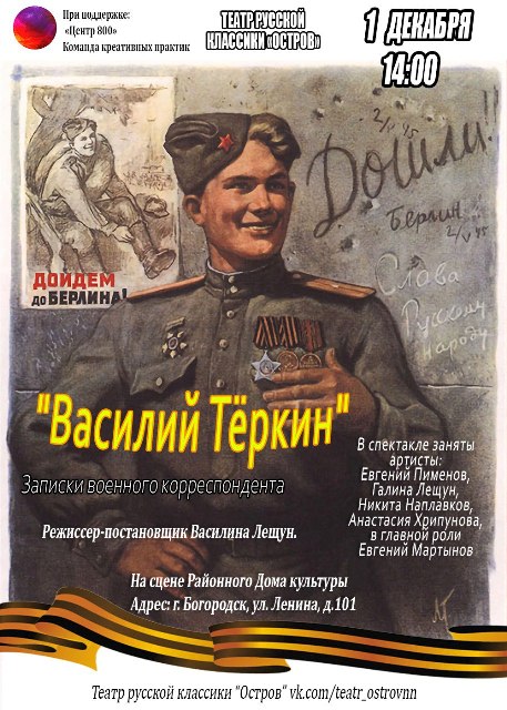 Центральным персонажем постановки является простой солдат Советской армии, гвардии рядовой Василий Тёркин. Вместе со своими боевыми друзьями и сослуживцами он сталкивается на своём тернистом пути с самыми разными событиями: горькими утратами, простыми человеческими радостями. Именно эти яркие моменты составляют эмоциональную ткань, помогая зрителям глубже почувствовать всю сложность военных будней и величие народного подвига. В спектакле звучат мелодии и песни военных лет.