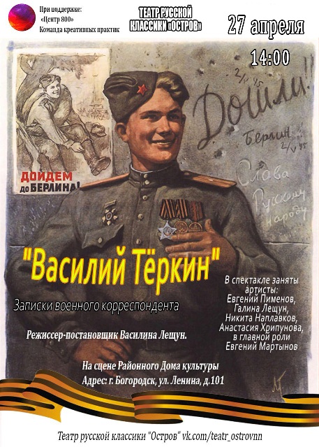 Центральным персонажем постановки является простой солдат Советской армии, гвардии рядовой Василий Тёркин. Вместе со своими боевыми друзьями и сослуживцами он сталкивается на своём тернистом пути с самыми разными событиями: горькими утратами, простыми человеческими радостями. Именно эти яркие моменты составляют эмоциональную ткань, помогая зрителям глубже почувствовать всю сложность военных будней и величие народного подвига. В спектакле звучат мелодии и песни военных лет.