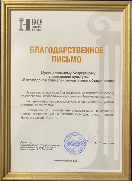 Нижегородский государственный академический театр оперы и балета имени А.С. Пушкина выразил благодарность администрации районного Дома культуры за совместную работу по реализации Федеральной программы «Пушкинская карта».